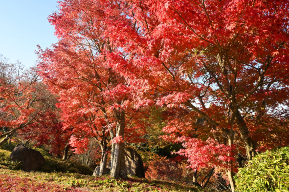 約50本のもみじとダイナミックな石組み、流れを見ることができます。高低差のある谷ですので、健脚の方向けコースです。もみじの谷開放期間:令和7年10月18日(土)から12月7日(日)